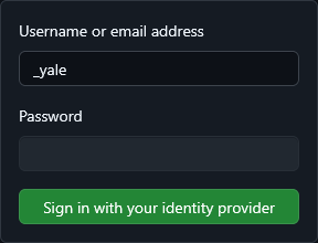 You can also sign in to your Yale-managed GitHub account from the usual GitHub login screen by typing _yale in the username field, then continuing to the Yale single sign-on provider: